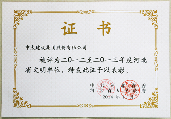 近日,中共河北省委、河北省人民政府公布“2012--2013年度河北省文明單位”評選結果,中太建設集團憑借良好的社會形象再斬殊榮,這也是集團公司連續(xù)8年獲此榮譽。