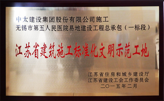 近日,由江蘇省住建廳傳來喜訊,由中太建設(shè)集團(tuán)承建、無錫分公司施工建設(shè)的無錫市第五人民醫(yī)院易地建設(shè)一標(biāo)段施工總承包工程,榮獲2014年下半年度“江蘇省建筑施工標(biāo)準(zhǔn)化文明示范工地”稱號(hào)。