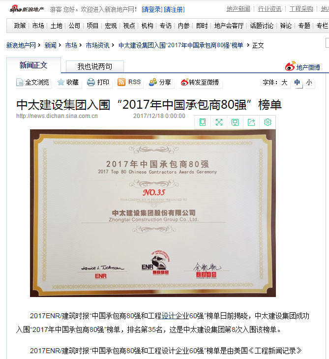 新浪網(wǎng)報(bào)道了“中太建設(shè)集團(tuán)入圍“2017年中國承包商80強(qiáng)”榜單”