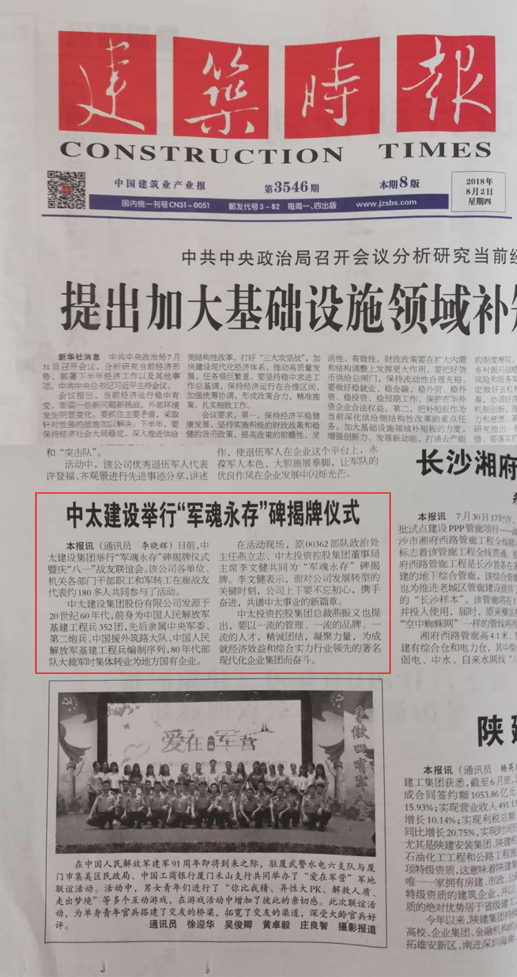 建筑時報8月2日報道了“中太建設(shè)集團“軍魂永存”碑揭牌儀式”
