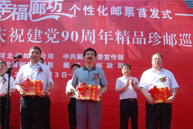 6月3日上午,由廊坊市委宣傳部與廊坊市郵政局共同推出的《黨旗飄揚 幸福廊坊》個性化郵票在廊坊市博物館舉行首發式。《黨旗飄揚·幸福廊坊》個性化郵票共“1+12”幅圖案。“1”即中心主圖案,體現廊坊市“龍鳳呈祥,京津對望”的區位優勢,“12”即12幅輔圖,其中4幅分別為會展中心、居民小區、文化藝術中心、中央生態城,體現“智能、生態、商務、休閑”的廊坊