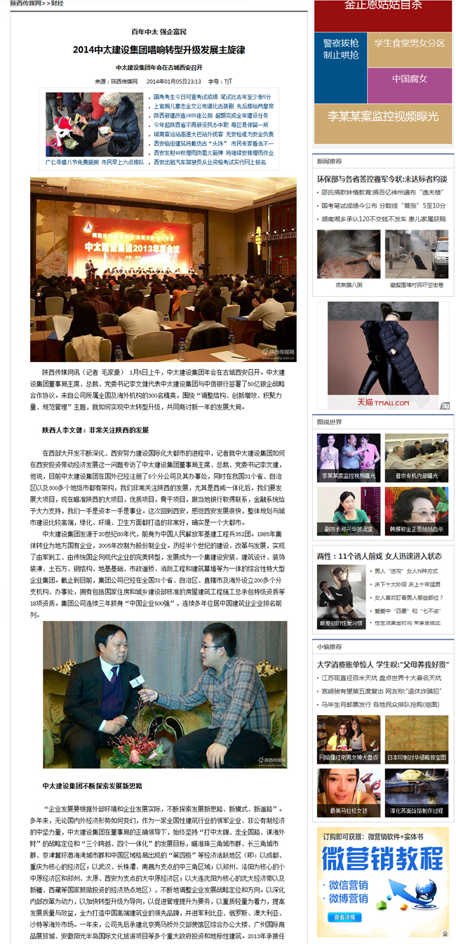 陜西傳媒網(wǎng)2014年01月05日報道了2014中太建設(shè)集團唱響轉(zhuǎn)型升級發(fā)展主旋律