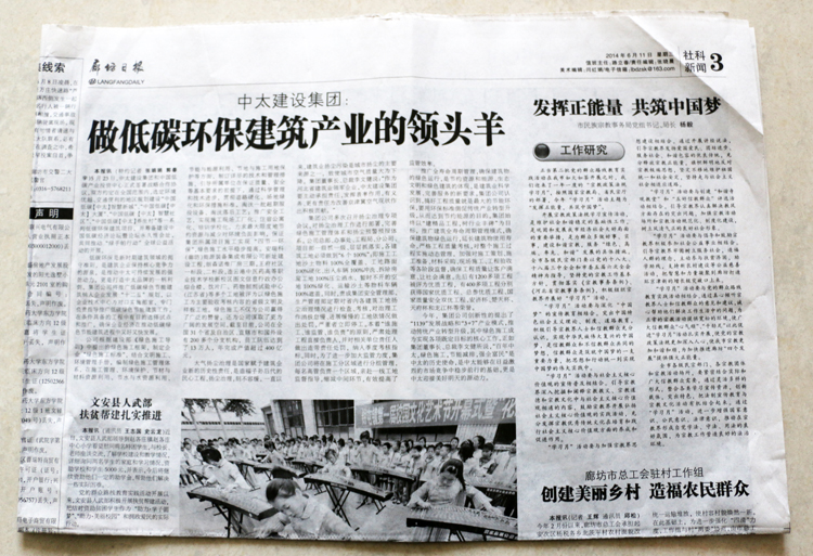 廊坊日報三版頭條報道了中太建設集團做低碳環(huán)保建筑產(chǎn)業(yè)的領頭羊
