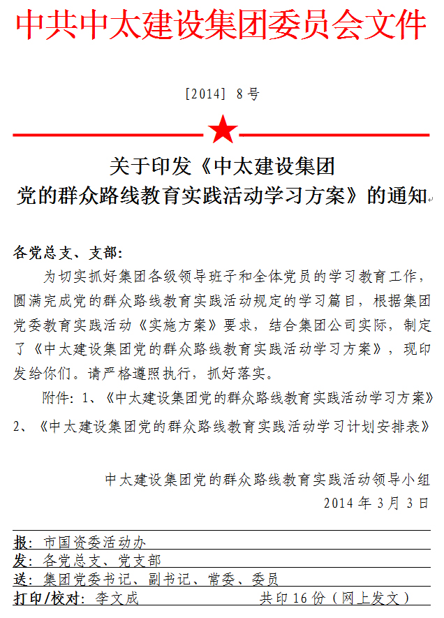 關于印發《中太建設集團黨的群眾路線教育實踐活動學習方案》的通知
