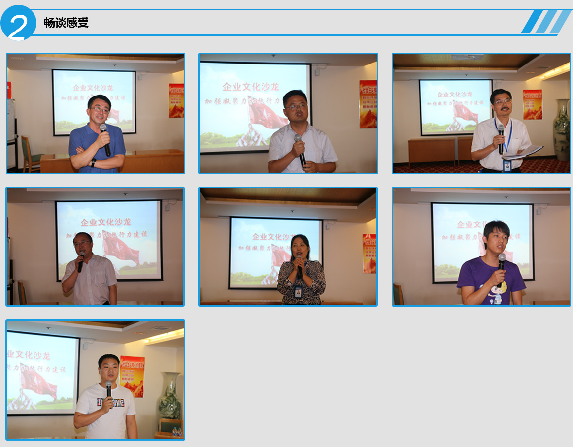 第二部分為領(lǐng)導(dǎo)暢談文化心得。一改傳統(tǒng)會(huì)議嚴(yán)肅形式,通過(guò)面對(duì)面交流拉近企業(yè)領(lǐng)導(dǎo)者和員工間的距離,通過(guò)輕松、自由的形式讓向全體員工企業(yè)文化魅力。